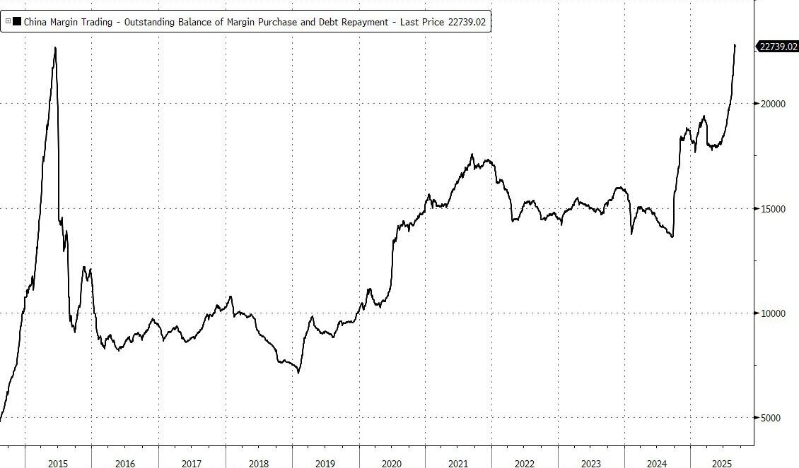 Outstanding margin balance earlier this week climbed to 2.28t yuan, surpassing the previous record of 2.27t yuan record set in 2015.