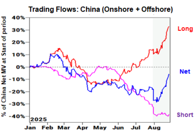 GS PB data shows Chinese equities last month with long buys dominating the flows.