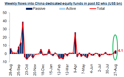 Flows into China equity funds picked up, with US$4.1b of net buying last week being the largest since Apr