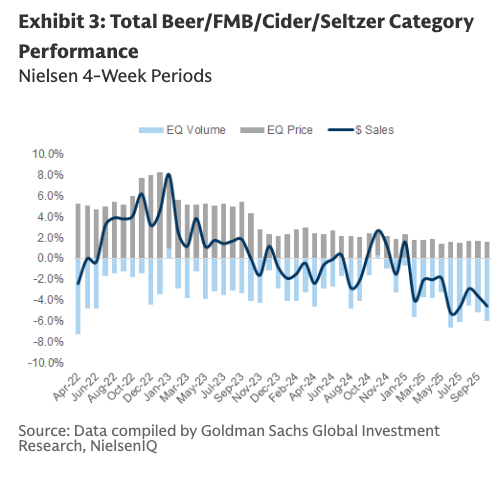 There's a lot to unpack in Goldman's alcoholic beverage trends note, which cites NielsenIQ data through September 20. A team of analysts led by Bonnie Herzog wrote the report. Here's the breakdown: