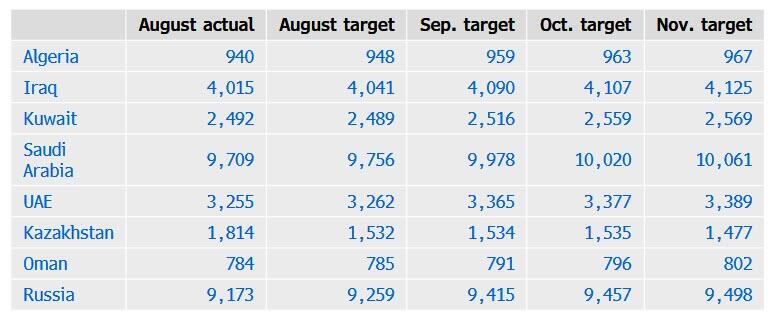 Following Sunday’s meeting, the new production targets for the eight countries for November are shown in the table below in thousands of barrels a day alongside their limits for August, September and October and their actual production in August, as reported by OPEC’s secondary sources.