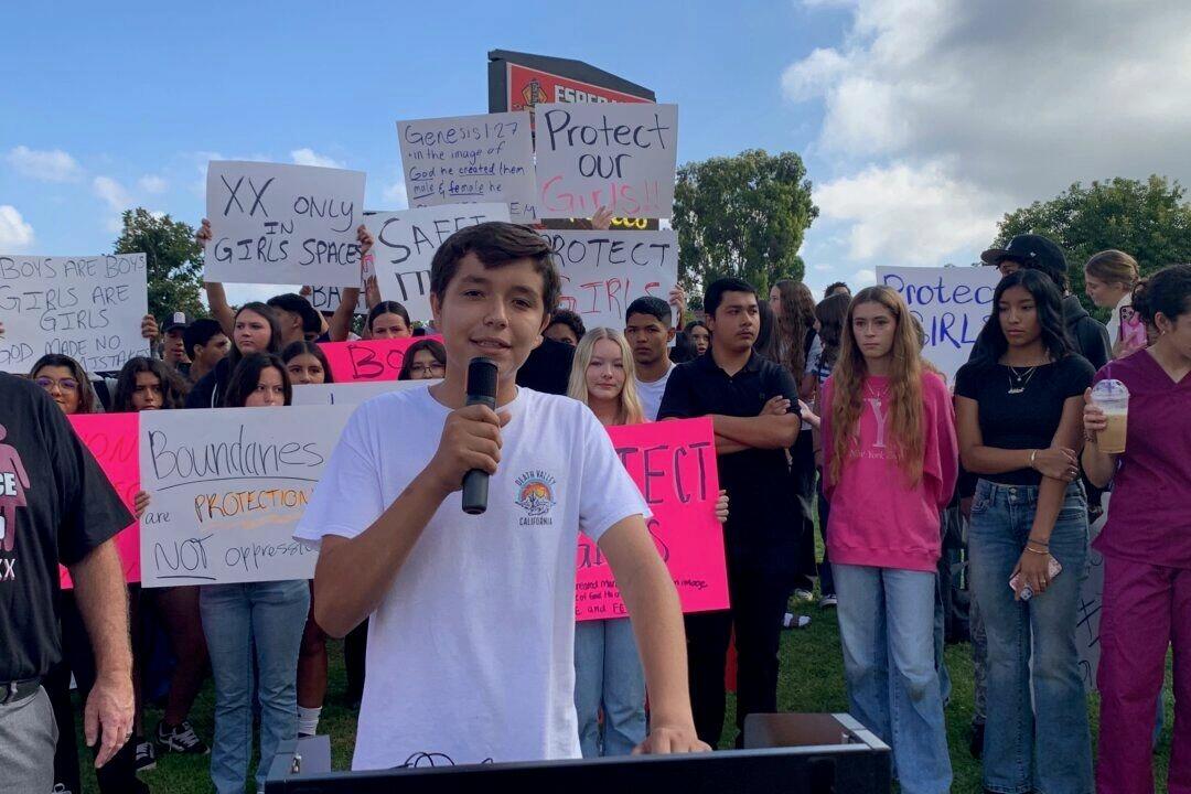 About 60 students walked out of morning classes on Oct. 1 to protest their high school’s policy allowing male students who identify as transgender to use girls’ bathrooms, in Anaheim, California.
